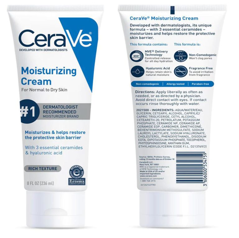 CeraVe Moisturizing Cream includes three essential ceramides and hyaluronic acid to effectively hydrate the skin and restore the skin’s protective barrier. Developed with dermatologists and suitable for dry and very dry skin on the face and body, this rich, non-greasy, fast-absorbing moisturizing cream features our patented MVE Delivery Technology to release a steady stream of moisturizing ingredients throughout the day and night. CeraVe Moisturizing Cream with ceramides is fragrance free.
