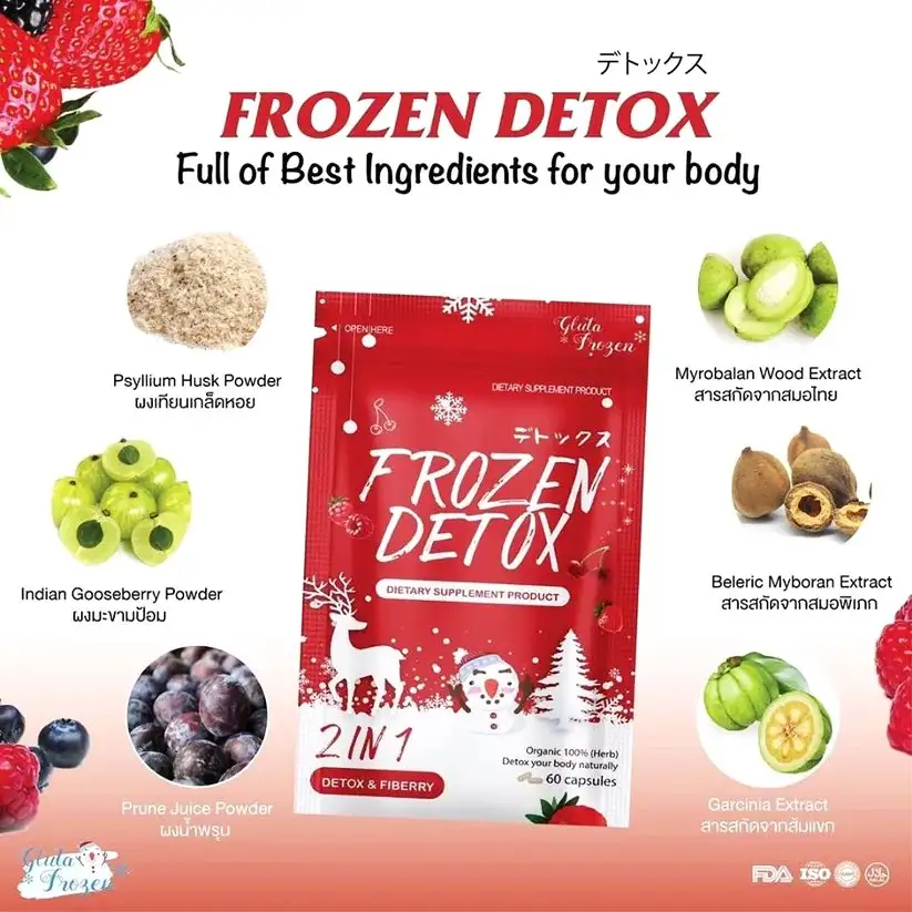 ফ্রোজেন ডিটক্স (Frozen Detox) একটি থাইল্যান্ডে উৎপাদিত ডায়েটারি সাপ্লিমেন্ট, যা শরীরের ডিটক্সিফিকেশন, হজমশক্তি উন্নত করা এবং ওজন নিয়ন্ত্রণে সহায়তা করার জন্য ডিজাইন করা হয়েছে। এটি প্রাকৃতিক ভেষজ উপাদান এবং ফাইবার-ভিত্তিক উপাদান দিয়ে তৈরি, যা থাইল্যান্ডের GMP (Good Manufacturing Practice) সার্টিফাইড সুবিধায় উৎপাদিত হয়।